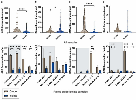 Comparison of non-protein amino acid concentrations in crude and isolate cultures. (a) N-(2-aminoethyl)glycine (AEG); (b) β-aminomethyl-L-alanine (BAMA); (c) β-N-methylamino-L-alanine (BMAA); and (d) 2,4-diaminobutyric acid (DAB) concentrations in all crude (brown; n = 27 samples with three technical replicates each, and isolate (blue; n = 16 samples with four technical replicates each) cultures and comparisons between paired crude and isolate cultures from the same original field sample. Error bars indicate standard error of the mean and not detected values were estimated as 1/10th of the method detection limit for the calculation of statistical differences via an unpaired t-test (α = 0.05) where * p < 0.05; ** p < 0.01; *** p < 0.001; **** p < 0.0001. Samples Bloom 2019 and Station W9 2018, highlighted in grey, were putatively identified as containing identical cyanobacterial species.