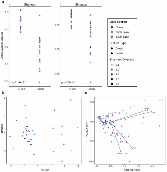 Correlations between microbial diversity and non-protein amino acid (NPAA) production in cultures. (a) Alpha diversity measures (Shannon, Simpson) of crude cultures (circles) compared to isolate cultures (triangles), colored according to the location of initial field collection site. Statistically significant differences were calculated by an unpaired t-test (α = 0.05). (b) Ordination (non-metric multi-dimensional scaling; NMDS) plot showing the beta diversity measure (Bray–Curtis distances) of crude cultures (circles) compared to isolate cultures (triangles), colored according to the location of initial field collection site. (c) Principal component analysis biplot of auto-scaled NPAA concentrations from crude cultures (circles) compared to isolate cultures (triangles), colored according to the location of initial field collection site and with alpha values (shading) showing the Shannon diversity scores. Undetected values were estimated as 1/10th of the method detection limit for statistical purposes.