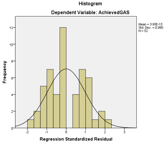 Regarding statistical methodology, a single-variable linear regression was initially used, followed by a multiple-variable regression. The dependent variable in this analysis was the Changed GAS-T score, which represents the difference between the Baseline GAS-T score and Achieved GAS-T score but not as a subtraction (as used with the other variables in order to quantify the difference between baseline and follow-up scores), but in the form of a complex mathematical function specifically developed to appraise overall changes to the Goal Attainment Scale. It can be calculated via the following formula or with the downloadable Excel spreadsheet [44]: