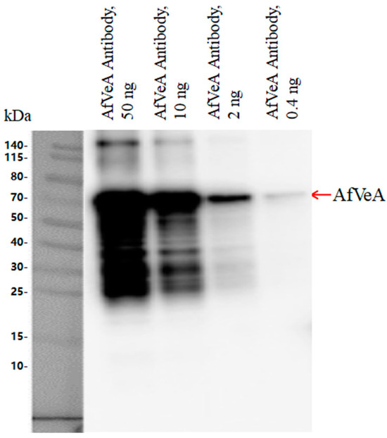 The molecular weight of recombinant AfVeA was around 63 kDa, and Western blot analysis showed that the multiclonal AfVeA antibody (0.4–50 ng) specifically bound to AfVeA (Figure 1). Next, VeA antibody was used for the CHIP-seq experiment, and the experimental results were analyzed by GO analysis. Gene functional annotation is widely facilitated by the standard facts in the description of gene function and enrichment analysis [21]. The Gene Ontology (GO) analysis classifies enriched genes into three categories, as shown in Figure S1A, including biological processes (BPs), molecular functions (MFs), and cellular components (CCs). A total of 66 differentially expressed genes (DEGs) were detected, with 22 in the BP category, 20 in the MF category, and 24 in the CC category. Regarding BPs (Figure S1B), significantly differentially expressed genes (DEGs) were predominantly enriched in signal transduction processes, involving cellular cytoskeleton organization, Rho protein signal transduction and its regulation, microtubule nucleation, and more. For MFs (Figure S1C), DEGs were mainly enriched in guanly nucleotide exchange factor activity and binding activity and manifested in glutaryl CoA dehydrogenase activity, Rho guanyl nucleotide exchange factor activity, tubulin binding, and protein binding. As for CCs (Figure S1D), DEGs were notably enriched in supramolecular complexes, predominantly found in microtubule, supramolecular complex, supramolecular polymer, supramolecular fiber, and others. The gene vepN was enriched in MFs, exhibiting binding activity, specifically nucleotide binding, small molecule binding, and nucleoside phosphate binding.