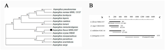 Gene sequences were sourced from the National Center for Biotechnology Information (NCBI). The vepN open reading frame (ORF) spans 1269 base pairs (bp), encoding a protein of 401 amino acids. Homologous proteins were also retrieved from the NCBI, and their evolutionary relationship was analyzed by using MEGA11.0. The analysis revealed that VepN in Aspergillus spp. group into a cluster, with A. flavus and A. oryzae exhibiting the highest identity (99% identity and 100% query coverage) (see Figure 2A). In A. flavus, the P-loop NTPase domain is predominantly situated at the C terminus. Furthermore, a comparative examination of genes harboring this domain in other Aspergillus species revealed that in Aspergillus niger and A. nidulans, the domain is positioned at the C terminus, whereas in Aspergillus fumigatus, it is split into two fragments (see Figure 2B).
