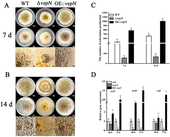 Aliquots of 3 μL of a 108 spores/mL suspension of the WT, ΔvepN, and vepN-com strains were point-inoculated onto GMM agar supplemented with 2% sorbitol (Sinopharm, Beijing, China) and incubated at 30 °C in the dark for 7 and 14 days [33]. The sclerotia were treated with 75% ethanol, observed, and counted in various areas. Each experiment was replicated three times per strain.