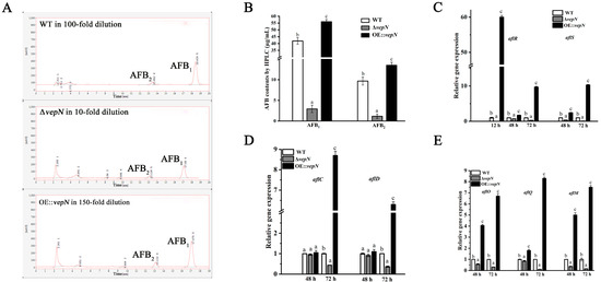 The roles of vepN in aflatoxin biosynthesis in A. flavus. (A,B) Liquid chromatography (HPLC) was used to determine the AFB profiles of the WT, ΔvepN, and OE::vepN grown on YES medium at 30 °C for 5 days. (The liquid chromatography profile shows that the three strains were diluted by different multiples.) (C–E) The q-PCR analysis of aflatoxin biosynthesis-related genes aflR, aflS, aflC, aflD, aflO, aflQ, and aflM. The error bars represent the standard errors, and different letters above the bars represent significantly different values (p < 0.05). (Three replicates were obtained for each strain.)