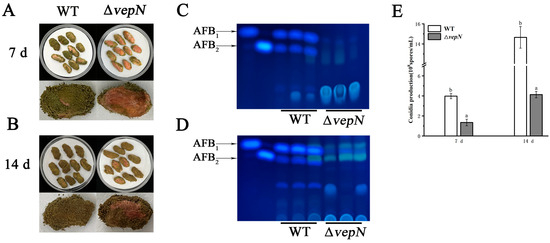 The role of vepN in the A. favus pathogenicity against peanut seeds. The infection of peanuts by the WT and ΔvepN at 7 (A) and 14 days (B). The production of AFB from peanuts infected by the WT and ΔvepN was detected by TLC at 7 (C) and 14 days (D). (E) Conidia production in infected peanuts. The error bars represent the standard errors, and different letters above the bars represent significantly different values (p < 0.05). (Three replicates were obtained for each strain.)