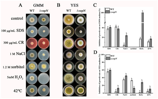 The roles of vepN in response to external stress in A. flavus. Colony growth morphology on GMM medium (A) and YES medium (B) under different stress conditions at 30 °C for 4 days. (C) The inhibition of the growth rate on GMM medium. (D) The inhibition of the growth rate on YES medium. The growth inhibition rate was calculated by measuring the colony diameter. The error bars represent the standard errors, and different letters above the bars represent significantly different values (p < 0.05). (Three replicates were obtained for each strain.)