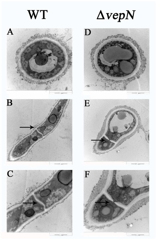 In the WT strain, the cell wall exhibited uniformity and was encased by a complete fibril layer with intact septa observed (refer to Figure 9A–C). Conversely, in the ΔvepN strain, varying levels of thickening were observed in the cell walls (Figure 9D), where the fibril layer appeared somewhat disrupted. Furthermore, the septum exhibited incomplete formation and partial blockage (Figure 9E,F), without complete segregation, potentially impacting intercellular communication.