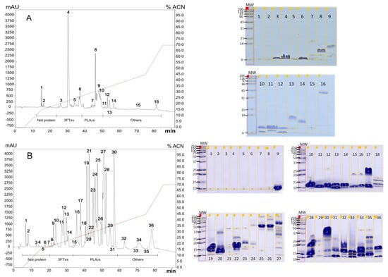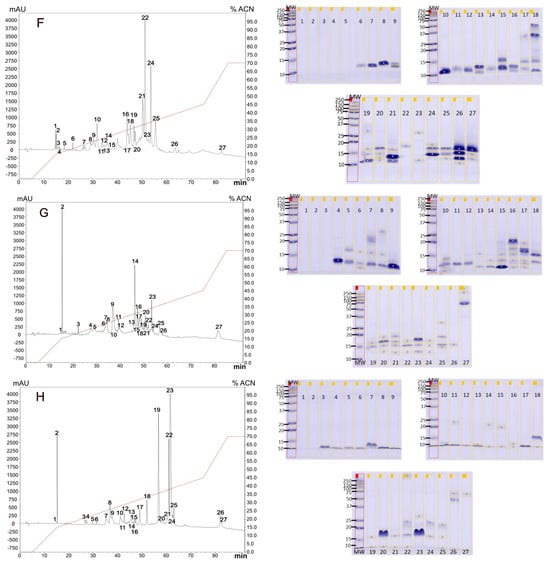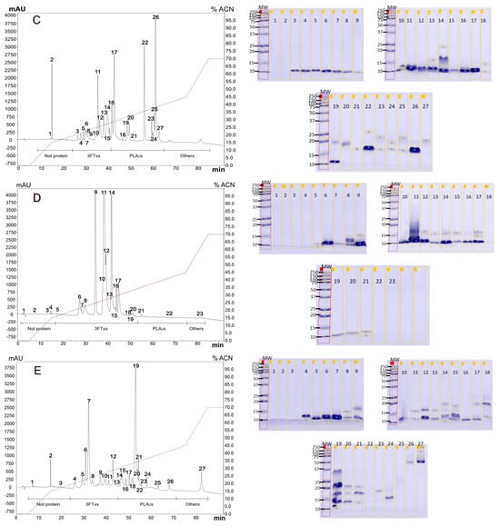 - Rodríguez-Vargas, A.; Franco-Vásquez, A.M.; Bolívar-Barbosa, J.A.; Vega, N.; Reyes-Montaño, E.; Arreguín-Espinosa, R.; Carbajal-Saucedo, A.; Angarita-Sierra, T.; Ruiz-Gómez, F. Unveiling the Venom Composition of the Colombian Coral Snakes Micrurus Helleri, M. Medemi, and M. Sangilensis. Toxins 2023, 15, 622. [Google Scholar] [CrossRef]