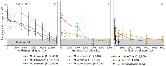 - World Health Organization. Annex 5: Guidelines for the production, control and regulation of snake antivenom immunoglobulins. In WHO Expert Committee on Biological Standardization; World Health Organization: Geneva, Switzerland, 2017; pp. 197–388. Available online: http://www.jstor.org/stable/resrep44225.16 (accessed on 1 May 2023).