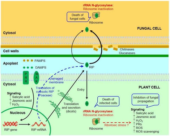 There are plant proteins that have rRNA N-glycosylase activity but do not show homology or structural similarity to type 1 RIPs [61], and have been classified under various names (e.g., “small RIPs”, “small RIP 1 candidates”, or “RIP-Like Proteins”). These proteins could therefore exhibit all or at least some of the biological properties of RIPs and could also be used as crop defense tools. However, it should be noted that, although they inhibit protein synthesis, the N-glycosylase assay has not been performed on all of them, so some may have a different enzymatic activity. In fungi, some proteins with rRNA N-glycosylase activity have also been found without homology or structural similarity to plant RIPs [62,63], some of which have shown antifungal activity.