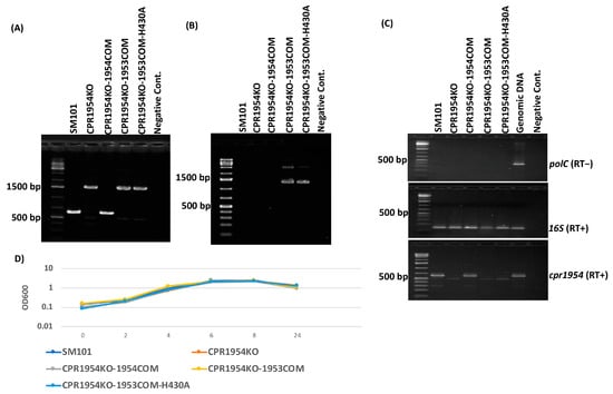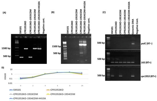 Results of those RT-PCR analyses demonstrated that CPR1953KO-1954COM and CPR1954KO-1953COM expressed their cpr1954 or cpr1953 genes, respectively, at significantly higher levels compared to SM101 (Figure 3A–D). No significant difference was noted in cpr1953 expression levels between SM101 vs. CPR1954KO or CPR1954KO-1954COM (Figure 3A,B). Similarly, no significant differences were apparent in cpr1954 expression levels between SM101 vs. CPR1953KO or CPR1953-1953COM (Figure 3C,D). In this experiment, all strains were shown by RT-PCR to express similar levels of the 16S RNA gene, used as a loading control (Figure 3A,C).