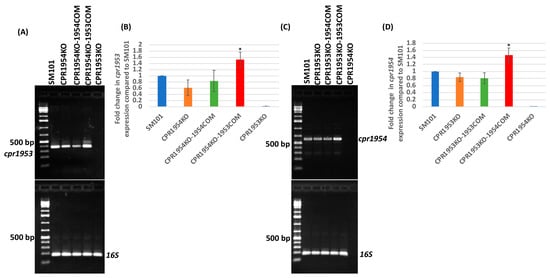 Comparing the expression levels of the cpr1953 and cpr1954 genes in various strains. (A) RT-PCR comparing the expression levels of the cpr1953 gene between SM101, CPR1954KO, CPR1954KO-1954COM, CPR1954KO-1953COM, and CPR1953KO. (B) Comparison of cpr1953 expression levels in SM101 versus its derivative isogenic null mutants or complementing strains as determined by densitometry using Image J software (version 1.53t). (C) RT-PCR comparing the expression levels of cpr1954 between SM101, CPR1953KO, CPR1953KO-1953COM, CPR1953KO-1954COM, and CPR1954KO. (D) Comparison of cpr1954 expression levels in SM101 versus its derivative strains as determined by densitometry using Image J software. In this assay, RT-PCR for 16S RNA was used as loading control. Figure is shown as a representation of three independent experiments. * p < 0.05 compared to SM101.