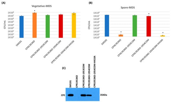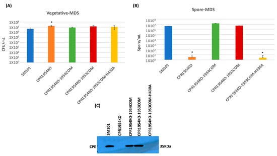 An experiment then evaluated whether overexpression of cpr1953 in the absence of cpr1954 expression, or overexpression of cpr1954 in the absence of cpr1953 expression, is sufficient to affect vegetative cell viability, spore formation, or CPE production when SM101 is cultured in MDS. Consistent with previous findings [], overnight MDS cultures of CPR1953KO and CPR1954KO produced slightly, but significantly, more viable vegetative cells compared to wild-type SM101 (Figure 4A and Figure 5A). Overnight MDS cultures of CPR1953KO-1954COM, CPR1953KO-1954COM-H410, CPR1954KO-1953COM, and CPR1954KO-1953COM-H430 did not contain significantly more viable vegetative cells compared to SM101 MDS cultures (Figure 4A and Figure 5A).