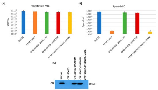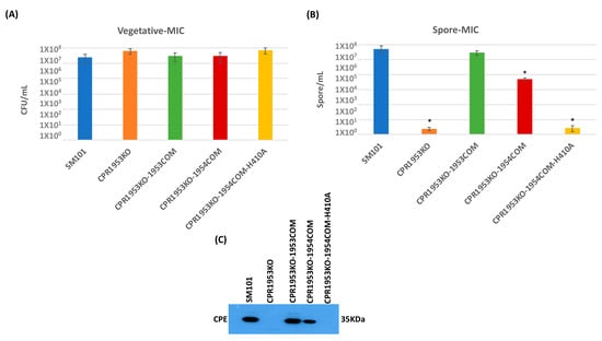 Evaluating the effect of overexpressing the cpr1953 gene in the absence of cpr1954 expression of vegetative cell viability, spore formation, and CPE production when SM101 and its derivatives were cultured in MIC. (A) Viable vegetative cells (CFU/mL) numbers for SM101, CPR1953KO, CPR1953KO-1953COM, CPR1953KO-1954COM, and CPR1953KO-1954COM-H1410A anaerobically cultured overnight at 37 °C in MIC containing 5% Oxyrase. (B) Heat-resistant spore counts (CFU/mL) in aliquots of those same MIC cultures after heating at 70 °C for 20 min to kill the remaining vegetative cells and spore germination induction. (C) Western blot analysis of CPE levels in supernatants of those overnight MIC cultures for SM101, CPR1953KO, CPR1953KO-1953COM, CPR1953KO-1954COM, and CPR1953KO-1954COM-H1410A. The size of the protein band is shown at right. Error bars depict SDs. All data were collected from three independent repetition. Asterisk represents p < 0.05 versus SM10. Western blot is representative of three independent experiments.