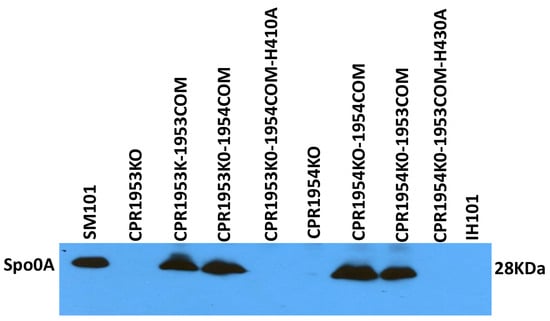 Results of this experiment determined that, as reported previously, the SM101 parental strain produces readily detectable levels of Spo0A, while the CPR1953KO and CPR1954KO mutants produce greatly reduced amounts of Spo0A. Furthermore, as also expected from previous results [], the CPR1953KO-1953COM and CPR1954KO-1954COM complementing strains exhibited near wild-type levels of Spo0A production. Importantly, results shown in Figure 8 also demonstrate for the first time that the overexpressing CPR1953KO-1954COM and CPR1954KO-1953COM strains produce Spo0A at wild-type levels (Figure 8). This effect required the kinase activity of CPR1954 or CPR1953, respectively, since the CPR1953KO-1954COM-H410 and CPR1954KO-1953COM-H430 strains did not produce Spo0A protein. In this study, spo0A null mutant (1H101) of SM101 was used as a negative control.
