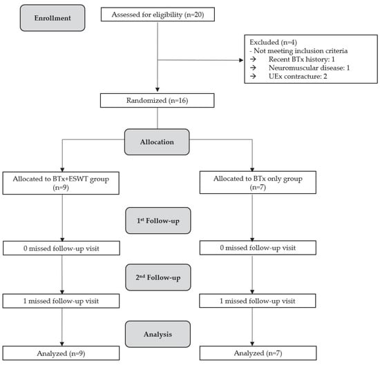 We consecutively enrolled 20 patients in this study. Four patients were excluded from the eligibility assessment. One patient received a recent BTx injection, two had contractures of their upper extremities, and one had a history of neuromuscular disease (Figure 1). Finally, 16 patients who were allocated in the study were randomly assigned to BTx + ESWT and BTx alone groups. Nine patients were assigned to the BTx + ESWT group, and seven were assigned to the BTx alone group. No significant difference was observed between the two groups in terms of baseline demographic characteristics and injected amount of BTx in each muscle, except for the time after stroke onset (Table 1). Six of the patients participating in the study were taking drugs for spasticity, such as dantrolene sodium and Baclofen. There was no significant difference in administration of drugs between the BTx with ESWT and the BTx alone groups. The average duration of rehabilitation for patients after the administration of botulinum toxin was 48.75 ± 82.61 min per week. There was no significant difference in treatment duration and frequency between the two groups. No serious adverse effects or complications occurred in the two groups during the study period.