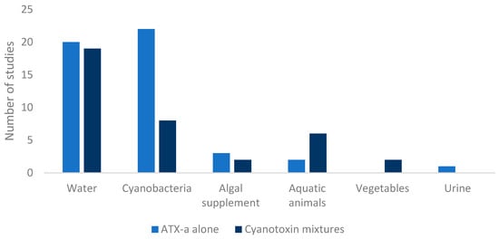 | Water samples | CYN, MCs (-LR, -RR, and -YR), and ATX-a | LC-MS/MS | - | LOD: 1.9–3.9 ng/mL LOQ: 5–10 ng/mL | The method separates the amino acid PHE, so there is no interference with ATX-a. The most common cyanotoxins can be simultaneously identified within 12.5 min, including several ATX-a analogues. For ATX-a: LOD: 1.9 ng/mL and LOQ: 5 ng/mL. | [64] |