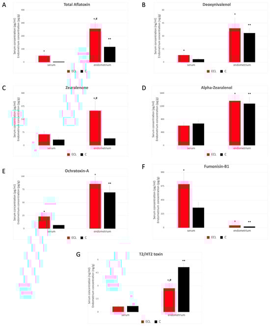 Mycotoxin level in serum and endometrial tissue (mean ± SD). ECLH: Low-grade and high-grade endometrial cancer (n = 18); and C: control (n = 21). (A–G): AFs (A), DON (B), ZEN (C), α-ZOL (D) OTA (E), FB1 (F), T2/HT2, and (G) concentrations in serum and endometrial tissues, measured in ECLH and C groups. We converted concentration mean values in the case of endometrium using 1.025 g/mL serum density value as a multiplier: pg/mL to pg/g, ng/mL to ng/g [17]. * ECLH serum level significantly differs from control serum level; + ECLH endometrium level significantly differs from ECLH serum level; # ECLH endometrium level significantly differs from control endometrium level; ** control endometrium level significantly differs from control serum level. [Detailed data can be found in the Supplementary Table S1] (Appendix A).