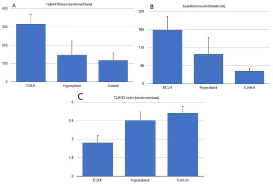 Endometrial tissue toxin concentrations in three groups (ECLH: Low-grade and high-grade, n = 18); (hyperplasia: simplex and complex hyperplasia and EIN, n = 6); (C: control, n = 21) measured in pg/g and ng/g. (A) AFs: Total aflatoxin concentration was measured in the endometrium of the three groups. All three groups significantly differ from each other. (B) ZEN: Zearalenon concentration was measured in the endometrium of the three groups. All three groups significantly differ from each other. (C) T2/HT2: Trichocetenes concentration was measured in the endometrium of the three groups. All three groups significantly differ from each other (Appendix A).