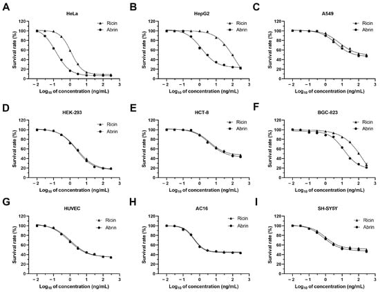Survival curves of nine human-derived cell lines upon exposure to ricin and abrin. HeLa (A), HepG2 (B), A549 (C), HEK-293 (D), HCT-8 (E), BGC-823 (F), HUVEC (G), AC16 (H), and SH-SY5Y (I) cells were seeded into 96-well cell culture plates at a density of 1.0 × 104 cells per well and were then exposed to a range of ricin and abrin concentrations, from 0.01 to 300 ng/mL, for 24 h. Cell viability was assessed and survival curves were generated using the CCK-8 assay.