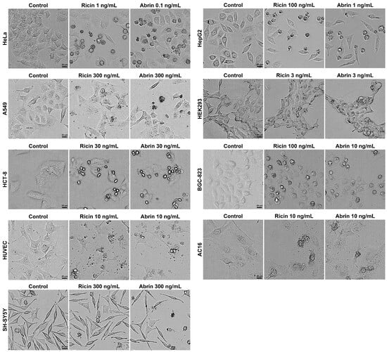 Different cell lines were seeded into 96-well cell culture plates at a density of 1.0 × 104 cells per well and exposed to ricin and abrin at indicated concentrations for 24 h. Cellular morphology was visualized and recorded using a high-content cell analysis system in bright-field mode. Scale bars: 20 μm.