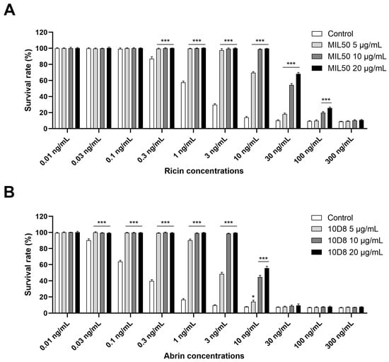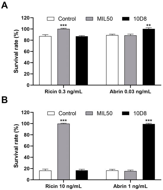 Assessment of neutralizing antibodies’ cross-reactivity. Low (A) and high (B) concentrations of ricin and abrin were treated with both MIL50 and 10D8 at a final concentration of 10 μg/mL for 1 h at 37 °C, then added to HeLa cells and incubated for 24 h at 37 °C. The survival rate of cells was calculated via CCK-8 assay. Data are presented as the mean ± SD (n = 3). Statistical significance was evaluated using one-way ANOVA (** p < 0.01, *** p < 0.001 vs. control).