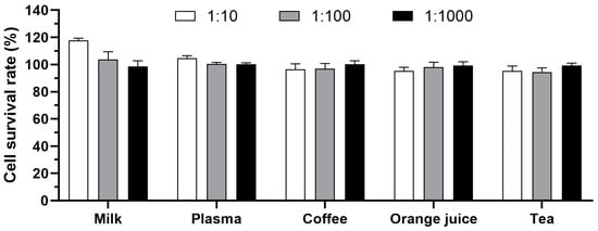 Impact of complex matrices on cell growth. Milk, plasma, coffee, orange juice, and tea were serially diluted to 1:10, 1:100, and 1:1000 with serum-free RPMI-1640 medium. The diluted samples were centrifuged, filtered, added to HeLa cells, and incubated for 24 h at 37 °C. The survival rate of cells was calculated via CCK-8 assay.