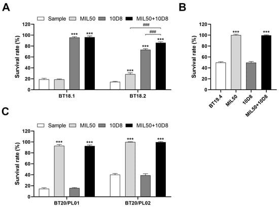 Detection of ricin and abrin from the samples of OPCW biotoxin exercises. (A) A 20 mg aliquot of each sample was dissolved in 1 mL PBS buffer, vortexed, and centrifuged. The resulting supernatant was subsequently diluted to a final ratio of 1:1000 with serum-free RPMI-1640 medium. (B) Spray buffer sample BT19.4 was diluted to a final ratio of 1:20,000 with serum-free RPMI-1640 medium. (C) Human plasma samples BT20/PL01 and BT20/PL02 were prepared via dilution to a final ratio of 1:1000 in serum-free RPMI-1640 medium. The diluted samples were preincubated with mAbs MIL50 or 10D8, either individually or in combination, at a final concentration of 10 μg/mL for 1 h at 37 °C and then added to cells. The cell survival rate was calculated via CCK-8 assay. Data are shown as the mean ± SD (n = 3). Statistical significance was determined using one-way ANOVA (*** p < 0.001 vs. sample, ### p < 0.001).