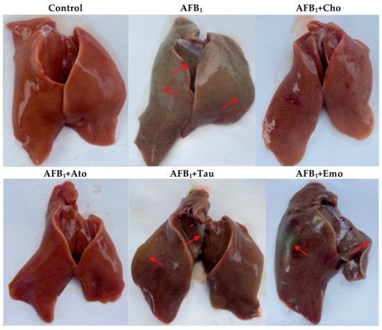 | Items | Control | AFB1 | AFB1 + Cho | AFB1 + Ato | AFB1 + Tau | AFB1 + Emo |