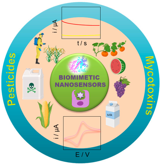 Schematic representation of an overview of the biomimetic nanosensors towards the detection of mycotoxins and pesticides.