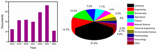 Several reviews have been published in recent years related to the detection of mycotoxins and pesticides [41,42,43]. Most of these reviews mainly focus on immunosensors [44] and chemical-based sensors [17,41]. No review attempts have been made specifically on biomimetic nanosensors. This review article discusses recent advancements in affinity-based biomimetic sensors and assays, with an emphasis on aptamers and MIP as recognition elements. The overall view of the current review paper is represented in Figure 1 as a schematic illustration. We mainly focus on some of the important mycotoxins and pesticide detection that are extensively employed. It discusses the application of these bio-receptors in electrochemical methods for the continuous monitoring of agricultural toxins, such as mycotoxins, pesticides, and herbicide residues, in food and environmental samples. The article evaluates the advantages and disadvantages of different detection methods to find the most rational and sensitive design for mycotoxins and pesticide residue detection. It also discusses the principal mechanisms and recent developments in affinity-based sensing methodologies for continuous monitoring of agricultural toxins, focusing on the fabrication protocols, advantages and disadvantages of affinity-based sensing systems, and various electrochemical transduction methods. Moreover, we have cited the recent 5 years of literature related to biomimetic nanosensors for the detection of mycotoxins and pesticides. We searched the literature (2018 to till now) on the Scopus database with the keywords “mycotoxins, pesticides, electrochemical detection, MIP, and aptamer”. A total of 306 articles (223 articles, 72 reviews, 9 book chapters, and 2 conference proceedings) were found. The respective Scopus search results are displayed in Figure 2.