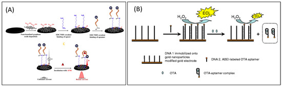 Electrochemically labeled aptasensors for the detection of mycotoxins. (A) Functionalized GO-based electrochemically labeled aptasensor for AFB1 detection employing an MB-labeled aptamer as the signaling fragment [20]. (B) AuNP-modified gold electrode and luminescence-labelled aptamer approach for OTA measurement in wheat samples [84].