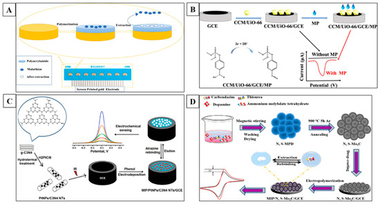 Carbendazim (CBZ) is a wide-range benzimidazole fungicide that is widely used in the agriculture sector to prevent disease growth in fruits and vegetables [121]. Its benzimidazole ring provides long-term stability, leading to its widespread distribution in water and soil environments, but it has been found to cause infertility and damage testicles in animals in research. As a result of the harmful effects that it has, the European Union and other countries have enacted stringent residue limits [122]. This study investigates the detection and quantification of CBZ. For this purpose, a film of MIP was fabricated on the surface of nitrogen- and sulfur-doped hollow Mo2C/C spheres (N, S-Mo2C). The sensor was prepared through a one-pot approach and carbonization at extreme temperatures. The N, S, and Mo2C were characterized using various techniques, including scanning electron microscopy, Fourier-transform infrared spectroscopy, TEM, and CV. The sensor’s practicality and reliability were demonstrated when it was applied to detect CBZ residue in fruits and vegetables, indicating its potential in various fields such as food quality control, drug monitoring, drug quality control, and environmental monitoring [75]. Additionally, the HKUST-1@MIPs-GE electrode was developed for CBZ detection [123]. Figure 7 represents the schematic illustrations of some of the important MIP based electrochemical sensors for the detection of pesticides.