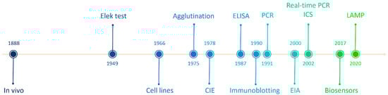 Corynebacterium; diphtheria toxin; methods of detection; in vivo methods; tissue culture cytotoxicity assays; Elek test; immunoassays; PCR; LAMP; biosensors Key Contribution: