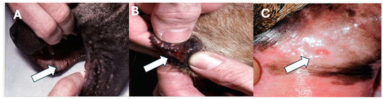 Definitive evidence of bite wounds was rarely reported, but seven dogs (8.4%) were described to have dried blood/areas of pinpoint, mild swelling, or pain around the muzzle/lips (Figure 1). No wounds or local tissue reactions were noted in cats.