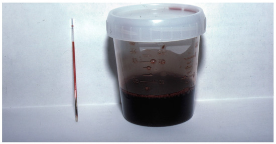 Packed cell volume and plasma total solids (PCV/TSs) were obtained in 66 dogs, and hemolysis was noted in 37.9% (25/66). At the same time, pigmenturia was only reported in 14.4% (12/83) of dogs based on history, physical exam, or observations during hospitalization. However, only five dogs had urinalysis performed, three of which had gross pigmenturia (Figure 2). Of the 25 dogs with hemolysis, 56% had concurrent neurologic signs (14/25), and of 12 dogs with pigmenturia, 75% had concurrent neurologic signs (9/12). All acute kidney injury (AKI) cases were noted to have hemolysis and gross pigmenturia and were undergoing MV, while AKI was not documented in any dogs that were not ventilated. It was impossible from the medical records to compare the severity of hemolysis and pigmenturia between dogs that developed AKI and those that did not. In contrast, no cats had documented hemolysis in the seven cats that had a PCV/TS performed. In addition, no AKI or pigmenturia was noted in any cat.
