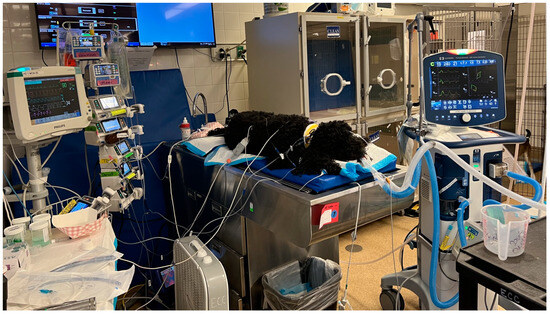 Mechanical ventilation was indicated in 12.0% (10/83) and performed in 10.8% (9/83) of dogs due to one owner declining care due to financial constraints. The decision to implement MV was based on a subjective assessment of detecting shallow chest excursions and detecting hypercapnia (PCO2 > 45 mmHg) on the blood gas analysis. Hypercapnia was documented in five of these dogs, with a mean PCO2 of 50.8 mmHg. Four other dogs had apparent shallow inspiratory chest movements upon physical examination. A referral veterinary hospital staff member transferred the last dog while being ventilated due to the dog already undergoing respiratory paralysis while at their facility. MV was not performed in any cats. Of the dogs receiving MV, the decision to ventilate was made within the first 4 h of hospitalization, except for one dog that initially presented obtunded with tetraparesis and pigmenturia. This dog was initially determined to have adequate ventilation (initial PCO2 34.5 mmHg), but then was noted to have shallow respirations and mild hypercapnia (PCO2 47 mmHg) approximately twelve hours after presentation when MV was initiated. Of the dogs receiving MV, 66.6% survived to discharge with a complete recovery. The mean duration on the ventilator was four days. The mean total visit cost for cases undergoing MV was USD 10,570 (range, USD 8136.26–USD 17,812). Complications associated with MV were common at 66.7% (6/9) and included AKI 44.4% (4/9), corneal ulceration 22.2% (2/9), and pneumonia 22.2% (2/9). No incidence of barotrauma was noted. Hemolytic and gastrointestinal signs were also common among dogs undergoing MV, occurring at 88.9% (8/9) and 44.4% (4/9), respectively (Table 2). The typical ventilator setup for a dog suffering from respiratory paralysis is depicted in Figure 3.