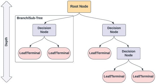 98]. A DT is a flowchart-like structure, resembling a tree structure with branches representing decision paths and leaves (or terminal nodes) representing predicted outcomes (see
