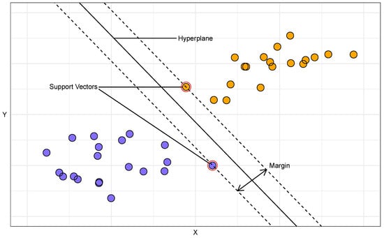 93] are a set of supervised learning methods used for classification, regression, and outlier detection. To make predictions, SVMs identify the optimal hyperplane that maximises the margin between the two classes (where the margin is defined as the distance between the nearest data points of each class and the dividing hyperplane). The data points that are closest to the hyperplane and that influence its position and orientation are known as support vectors, as they