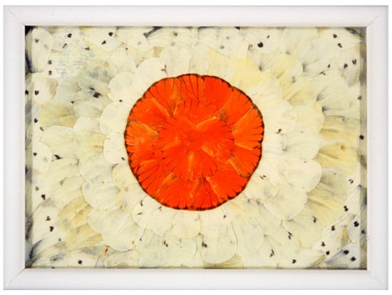 Handmade butterfly picture of the national flag of Japan. The central red circle on the flag was made from the red wings of Appias nero, and the white portion was made from the common cabbage butterfly, Pieris rapae.
