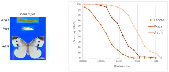 Cytotoxic effects of extracts from the larvae, pupae, and adults of P. rapae. Extracts from larvae, pupae, and adults were incubated at various dilutions with TMK-1 cells and after 48 h incubation at 37 °C in 5% CO2 in air. The number of living cells was measured with XTT cell proliferation assay [2].