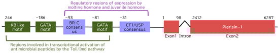 Transcriptional regulatory motifs: Several transcriptional regulating motifs, including BR-C (Broad Complex), CF1/USP (Cockerell Factor 1/Ultraspiracle), κB-like motifs, and GATA motifs, were found in close proximity to the transcription start site of the pierisin-1 gene. BR-C is known to control the response to ecdysone by binding to the promoter regions of target genes. CF1/USP forms heterodimers with ecdysone receptors and binds juvenile hormones. κB-like motifs are recognized by the κB family proteins for transactivation and are commonly present in the regulatory regions of many antimicrobial protein genes in insects. GATA motifs are also closely situated in the regulatory regions of numerous immunity genes.