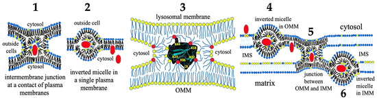 Figure 1. Cytotoxin internalization/translocation through plasma membrane, OMM, and IMM. 1—Intermembrane junction triggered by CTII (red) at a contact of two plasma membranes. 2—CTII settles in an inverted micelle in a single membrane after fission of an intermembrane junction. Due to the high surface curvature, the inverted micelle fuses with the lipid bilayer to release CTII into the cytosol. 3—contact between the outer mitochondrial membrane (OMM) and lysosomal membranes triggered by CTII to generate a new intermembrane junction. Amino acid residues of CTII (illustrated representation), K23, R36, and K12 bind to the OMM surface and L9 penetrates to the hydrophobic region of OMM. Amino acid residues K44, K18, K5, and K35 on another side of the CTII attract acidic lipids of the neighboring lysosome to form an intermembrane junction. 4—CTII settles in the inverted micelle in OMM following fission of the intermembrane junction, which then releases CTII into the intermembrane space (IMS). 5—CTII binds to CLs on the OMM and the IMM to form another intermembrane junction between OMM and IMM. 6—CTII settles in the inverted micelle in IMM after fission of the affected regions of the OMM and IMM. At high concentration, CTII disturbs the integrity of the IMM, whereas CTII at very low concentrations increases the “plasticity” of IMM to facilitate ATP synthesis. In 1, 2, 4, 5, and 6 the head groups of cardiolipins (CLs) are colored yellow and the head groups of phosphatidylcholines (PCs) are colored blue. In 3, the head groups of CLs are colored red and the head groups of PCs are colored yellow. In all schematics, the cytotoxins that permeate and translocate through the membranes are indicated with a large red circle. This figure was modified and readapted from [2,15,37].