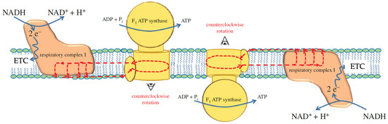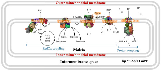 All components of the electron transport chain (ETC) are contained in the IMM, which separates the matrix from the intermembrane space. The basic concept of mitochondrial oxidative phosphorylation is based on a coupling between redox processes across all of the four complexes I-IV, the translocation of protons through the ATP synthase, and the synthesis of ATP. The overall coupling can be divided into two distinct processes: redox coupling and proton coupling (Figure 2) [40]. In redox coupling, the exothermic oxidation–reduction reactions are coupled with the translocation of protons against the concentration gradient from the matrix into the intermembrane space, and this coupling involves the four Complexes I through to IV [41]. In the proton coupling, which involves only ATP synthase—Complex V, the movement of protons down the concentration gradient from the intermembrane space into the matrix is coupled with ATP synthesis and this coupling is the most essential part of the oxidative phosphorylation process [40]. There has been a great deal of effort focused on understanding the structural–functional aspects of respiratory complexes I, II, III, IV, and ATP synthase and on elucidating physical–chemical aspects of coupling between the ETC and the ATP synthase, which are meticulously and comprehensively described in the excellent review by Kocherginsky [42]. One of the important findings that came out from these endeavors was the understanding that the respiratory complexes are tightly aggregated in super-complexes [43,44,45] and that the loss of tight aggregation of respiratory complexes leads to a decrease in coupling of the redox reactions with the proton transport and an increase in production of reactive oxygen species (ROS) [43,46]. The aggregation of ATP synthase with respiratory complexes has not been observed [44]; however, ATP synthases form dimers [47] which are needed for creation of cristae [48] and entrapment of protons in the crista tips [49]. In the highly respiring mitochondria, ATP synthases oligomerize to form supramolecular structures of ATP synthase dimers, increasing the rate of ATP synthesis and helping mitochondria to cope with the higher energy demand of respiring cells [50].