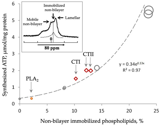 Figure 5. Correlation of ATP synthesis and the percentage of immobilized non-bilayer lipids in mitochondria samples. The percentage of these lipids was varied through increasing the temperature or adding CTI, CTII, or PLA2. Immobilized lipids were observed in the 31P-NMR spectra at 6 ppm; this signal was retained after applying a DANTE train of saturation pulses to the high-field peak of the lamellar spectral component [20]. The ATP levels, expressed as μmol ATP synthesized per mg of mitochondrial proteins, were monitored via taking measurements from aliquots from the 31P-NMR sample tubes. The open circles of progressively increasing size represent measurements taken from untreated mitochondria at 8, 15, 25, and 40 °C. The sizes of the markers overlap the error values. Data points were obtained from [20,37]. Typical 31P-NMR spectra are presented in the inset (the thin line below the main spectrum shows the 6 ppm signal remaining after the DANTE train). This figure has been adapted from [21].