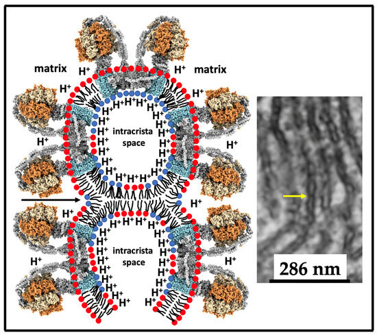 Figure 6. Intermembrane junctions increase the concentration of protons along the crista inner membrane surface. On the left is a schematic of two crista compartments that form rafts on the outer surface of the compartments, which are separated by an intermembrane junction—as indicated with the black arrow. The atomic structure of ATP synthase was reconstituted by Dr. S. V. Nesterov of the Moscow Institute of Physics and Technology (PDB # 6B8H) using the ChimeraX program (UCSF) [144,145]. The α- and β-subunits of the catalytic domain are shown in yellow and orange, respectively; the C ring is shown in blue. All other subunits are shown grey. The polar heads of cardiolipin are shown in blue. Phospholipids with red polar heads represent other phospholipids in IMM with two alkyl chains. To provide better clarity, the alkyl chains of phospholipids are not drawn over the ATP synthase hydrophobic subunits. On the right is a transmission electron microscopy image modified from [53] that shows intermembrane junctions between the membranes of the cristae (yellow arrows) that separate the cristae rafts. This figure is modified from [15].