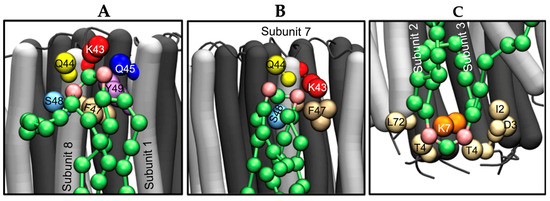 Figure 7. Modes of cardiolipin binding to subunits of C8-rings. The N- and C-terminal α-helices of C-subunits are shown as long dark and gray rods, respectively. Cardiolipin phosphate groups are depicted in pink and other groups are shown in green. The large colored spheres representing the coarse-grain beads of specific amino acids lie within 0.7 nm of the phosphate beads of cardiolipin. (A,B) Schematic showing the head-group region of cardiolipin on the matrix side of the crista leaflet bound to K43 and adjacent residues on C subunits 8 and 1. (C) Schematic showing the head-group region of cardiolipin on the intra-cristae side of the crista bound to K7 and adjacent residues of the C subunit. This Figure was adapted from [142].