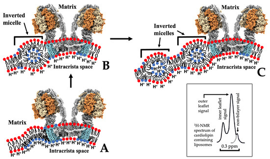 Figure 8. Inverted micelles predominantly made of cardiolipin serve as nanocarriers of protons, transporting protons from the Fo unit of ATP synthase to respiratory complexes at the IMM that act as proton pumps. The increased density of protons at the Fo unit of ATP synthase increases the conical shape of cardiolipin molecules (A) and triggers the formation of inverted micelles carrying H+ ions (B) inside the membrane to the nearest proton pump. The formation of inverted micelles is coupled to the removal of cardiolipin from the conserved lysine residues of the rotor to promote spinning of the rotor and ATP synthesis in the clockwise direction. Newly formed inverted micelles push previously made inverted micelles (C) towards the proton pump. Reconstitution of ATP synthase and designation of phospholipids are described in Figure 6. The inset shows the 1H-NMR signal of cardiolipin + phosphatidylcholine liposomes treated with cardiotoxin CTII in solution of [Fe(CN)6]3− ions. The non-bilayer signal of inverted micelles coexisting with the intact signals from inner and outer leaflets of liposomal membrane in solution of [Fe(CN)6]3− ions suggest that inverted micelles do not compromise the structural integrity of the liposomal membrane. Figures A and B are modified from [15]. Inset is modified from [37].