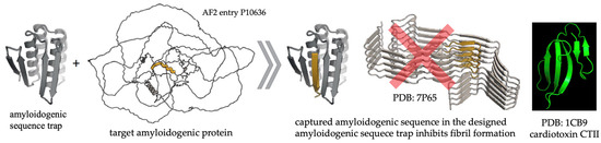 Figure 9. Schematic showing a custom amyloidogenic sequence trap (left, gray) that can bind amyloidogenic sequences (yellow ribbon, right) and block fibril formation. Amyloidogenic sequences form amyloid fibrils through strand–strand interactions (right); AF2, AlphaFold2. Illustrated representation of cobra cardiotoxin CTII with anti-parallel β-sheets, suggesting that cobra cytotoxins could possibly serve as a natural amyloidogenic sequence trap. This figure has been modified from [148].