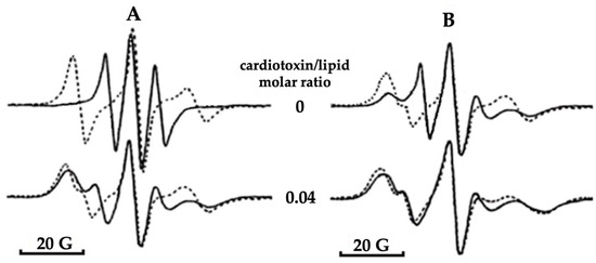 Figure 10. EPR spectra of 5-DSA acid in oriented multibilayer lipid films of phosphatidylcholine + 5% cardiolipin (A) and oriented multibilayer lipid films of phosphatidylcholine + 20% cardiolipin (B) containing a 5-DSA–lipid molar ratio of 1/100 at 18 °C. The EPR spectra in multibilayer films were recorded with the magnetic field parallel (broken lines) and perpendicular (solid lines) to the bilayer normal. Multibilayer films were treated with cytotoxin VII4 at the indicated cytotoxin-to-lipid molar ratios. This figure has been adapted from [36].