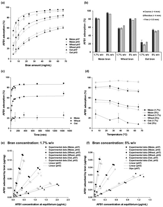 Effects of bran amount and pH (a), particle size (b), binding time (c), temperature (d), and AFB1 concentration (e,f) on AFB1 adsorption by maize, wheat, and oat bran. Equilibrium adsorption isotherms were obtained at constant temperature (25 °C) and pH (3 and 7) by a fixed amount of AFB1 (1 μg/mL) with an increasing bran amount (3–67 mg/mL corresponding to 0.3–6.7% w/v) (a) or by a fixed amount of bran at 17 mg/mL (1.7% w/v, (e)) and 50 mg/mL (5% w/v, (f)) with increasing AFB1 concentrations (0.05–5 μg/mL). Adsorption experiments were performed at pH 7 using 1.7% w/v or 5% w/v of bran amount and 1 μg/mL AFB1 concentration under 25 °C (b,c) or different temperatures (5–65 °C, (d)). The presented data are the mean ± standard deviation from three replicates (a–d).